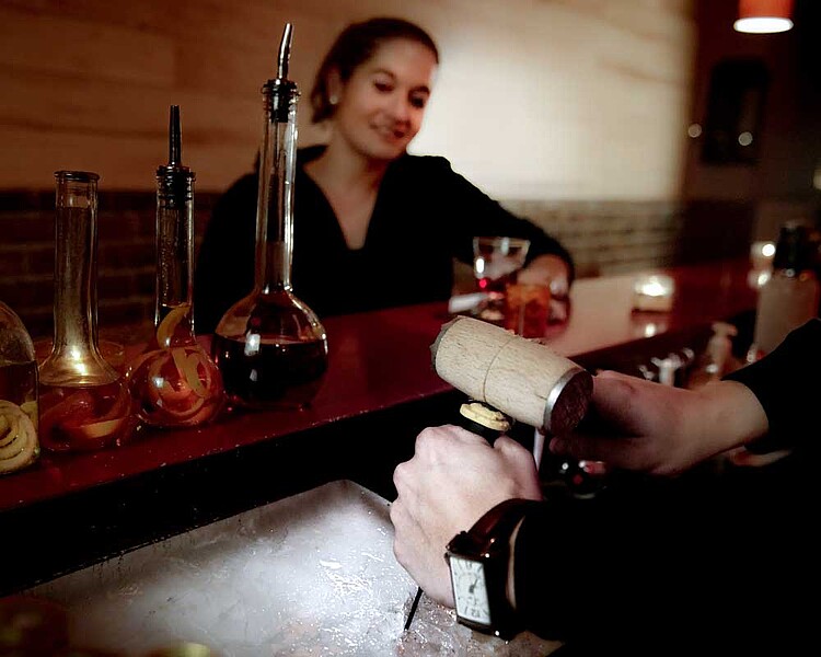Wenn man allein kommt und auf ein Pläuschchen aus ins, kann man an der Bar sitzen und mit den Chefs ungezwungen ins Gespräch kommen. Man erfährt dann zum Beispiel, welche beeindruckende Geschichte die Romanos mit sich bringen und kann nur staunen, wie viel Professionalität sich die beiden in ihrem jungen Leben bereits angeeignet haben: Alessandro Romanos Karriere begann zum Beispiel im Kölner Hyatt Hotel. 2006 wurde er in Birmingham als „Bartender of the year“ gekürt. Später arbeitete er in einem Luxushotel in Dubai, im Hotel Burj Al Arab. Hier hat er zusammen mit Felix Hartmann den teuersten Cocktail der Welt erfunden, der sogar ins Guinnes Buch der Rekorde eingegangen ist. Alessandros Frau, Conny, hat ebenfalls als Restaurantleiterin in Dubai gearbeitet. Die beiden wissen also, wovon Sie sprechen, wenn es um professionell gemixte Cocktails und Service der besonderen Art geht. Inzwischen bieten sie auch Schulungen an – für Cocktailbars genauso wie für den interessierten Laien.