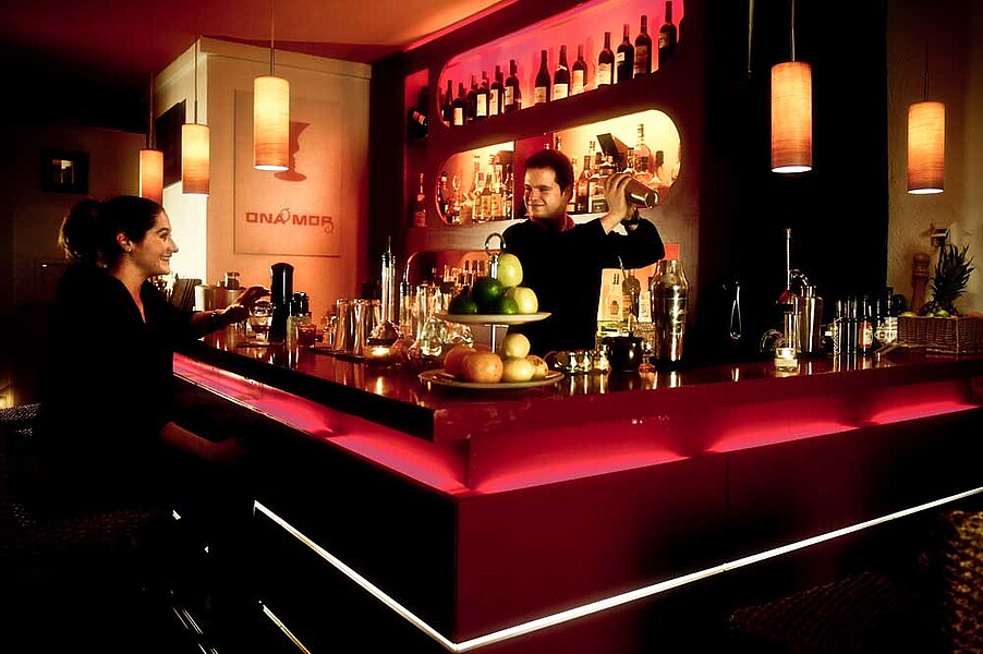 Man muss anklopfen, um hier eingelassen zu werden. Doch was zunächst elitär wirkt, ist auf den zweiten Blick ein nettes Konzept: Die beiden Betreiber der Ona Mor Cocktailbar, Alessandro und Conny Romano, möchten alle Gäste persönlich begrüßen. Und so kommt es, dass man – nachdem man den gusseisernen Klopfring betätigt hat – in ein bisher verborgenes Reich eintritt, einen kleinen, gemütlichen Raum mit sanfter Beleuchtung. Hier ist Platz für etwa 40 Gäste. Beige und Orange sind die Ton angebenden Farben. Schlichte Holztische stehen neben den einladenden Sofabänken, und Kuhfelle liegen auf dem dunklen Laminat.