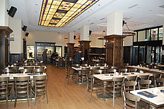 Herzstück des Gaffel am Dom ist der 700 Quadratmeter große, dunkel getäfelte Schankraum im Erdgeschoss, der sich über das gesamte Gebäude erstreckt. Das 27 Meter lange, farbige Glasdach sorgt tagsüber für ein angenehmes Oberlicht. Für Gäste, die bei schönem Wetter draußen sitzen möchten, gibt es schließlich auf dem Bahnhofsvorplatz dreihundert weitere Sitzplätze.