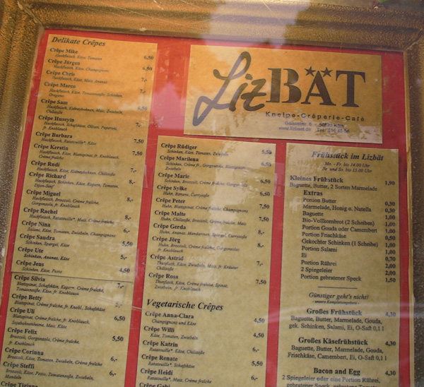 Mitten in Ehrenfeld gelegen, ist das Crêpe-Restaurant „Lizbät“ für all diejenigen zu empfehlen, für die eine gemütliche Atmosphäre mit gemischtem Publikum und netter Bedienung wichtiger ist als luxuriöses Ambiente. Im „Lizbät“ ist viel los, es wird laut geredet und gelacht. Einen Tisch reservieren ist leider nicht möglich, aber laut Aussage der Kellnerin werden in der Regel relativ schnell Tische frei. Angeboten werden Crêpes mit Namen wie „Jürgen“ (Hackfleisch, Käse, Champignons) oder „Renate“ (Ratatouille, Schafskäse). Von Fleisch bis Geflügel und Gemüse hat man eine breite Auswahl an Füllungen. Das Essen ist sättigend und sehr lecker – einfach mal etwas anderes. Und dazu noch günstig: Die Crêpes kosten im Schnitt zwischen 3 und 8 €, das Kölsch 1,50 €.