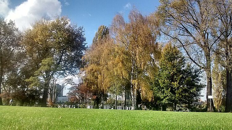 Verlassen Sie die Brücke am nächsten Fußgängeraufgang, um parallel zu „An der Schanz“ / „Riehler Straße“ ein schönes Stück durch die Riehler Aue zu laufen. Laufen Sie in an der linksrheinischen Station der Kölner Seilbahn vorbei in Richtung Zoobrücke und knacken Sie die 5 Kilometergrenze.