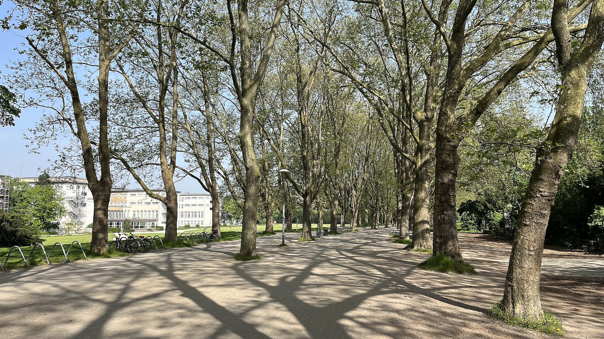 Jetzt geht es einmal quer durch die Grünanlage, die sich von der Luxemburger Straße bis zum nördlichen Rheinufer zieht. Das Grünstück ist in mehrere Teilflächen unterteilt, sodass man je nach Lust und Laune die Strecke ausweiten oder verkürzen kann. Man muss dafür aber immer wieder Querstraßen kreuzen. Unser Lauf führt uns nicht das komplette Grün entlang, sondern lediglich am Colonius Fernsehturm vorbei (ca. 2,5 km), über die Subbelrather Straße bis kurz vor die Gleisanlagen der Bundesbahn. Hier hat man die Hälfte (ca. 4 km) hinter sich gebracht. In einer weiten Kurve geht es wieder den ganzen Weg zurück bis zum Aachener Weiher.
