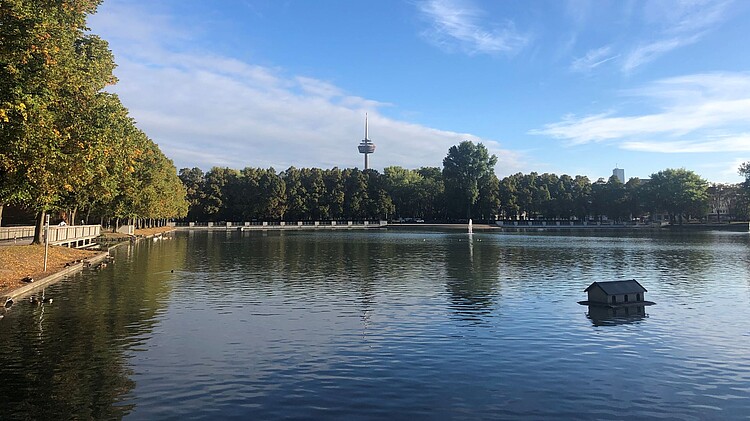 Es geht geradeaus weiter auf den Aachener Weiher zu. An einer kleinen Weggabelung halten wir uns rechts, um ein kleines Stück bergab durch ein winziges Waldstück zu joggen. Mit dem Abstieg hinter uns haben wir Kilometer eins geschafft und blicken jetzt auf den Weiher. Wir bleiben rechts und biegen am Ende des quadratisch angelegten Gewässers links ab. Am Ende der „zweiten Seite“ des Weihers laufen wir rechts auf die Aachener Straße zu, um an dieser weiter links bis zur Ampelkreuzung zu laufen und diese zu überqueren. Es geht die Aachener zurück und wir biegen links in den Inneren Grüngürtel ab (mittig gegenüber dem Aachener Weiher).