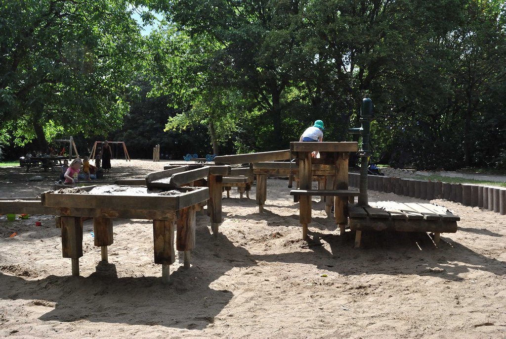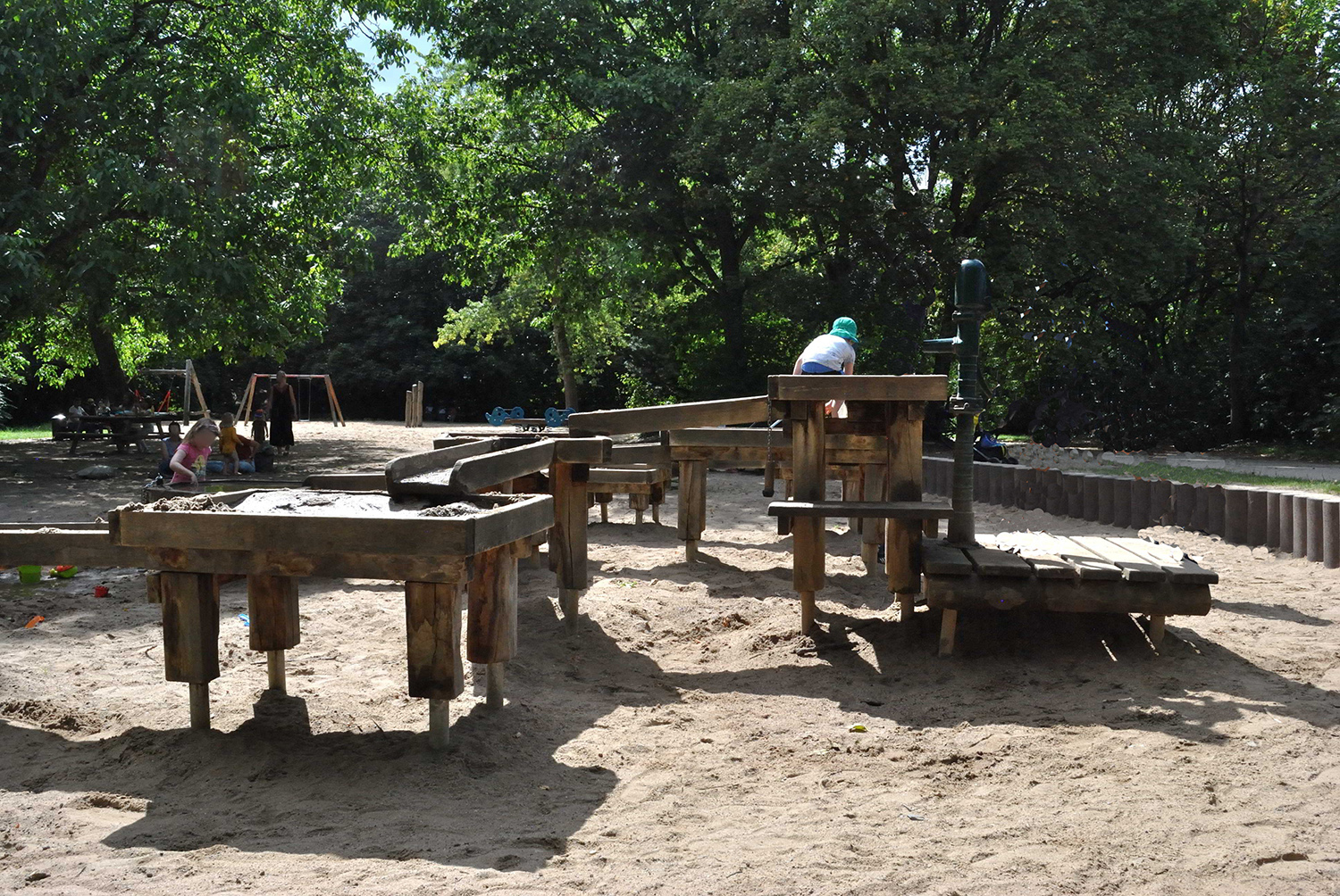 Die besten Sonntagskleider sollten hier aber nicht getragen werden: Im Nippeser Tälchen wird es nämlich nass und matschig. Dafür sorgt eine Wasserpumpe, die in eine verzweigte Holzkonstruktion integriert ist. Die Kinder können das Wasser per Knopfdruck aus der Leitung befördern und durch die hölzernen Kanäle leiten, Staudämme aus Sand errichten oder kleine Spielzeugboote auf die ganz große Fahrt schicken.