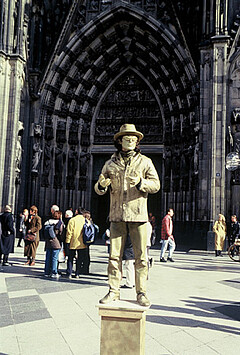 Die Außenskulpturen am Kölner Dom sind aus Kalkstein. Die Arkadenbögen z.B. zeigen eine bunt gemischte Gesellschaft aus Altem und Neuem Testament, Propheten ebenso wie Heilige und Engel. Außerdem gibt es einige berühmte Persönlichkeiten aus Köln zu bestaunen.