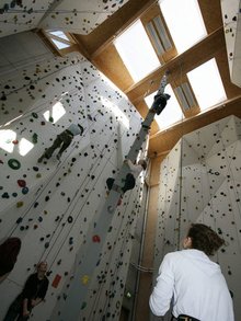An der Kletterwand der Sporthochschule Köln gibt es auf 20 Toprope-Routen der Schwierigkeitsgrade II bis VIII-.
