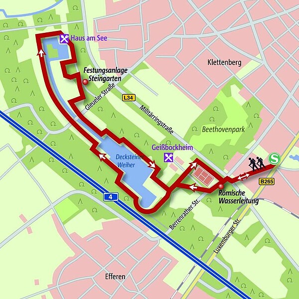 Nach der Besichtigung verlassen wir den Innenhof wieder in Richtung des Decksteiner Weihers, gehen zu den Alleen am Ufer zurück und setzen dort unseren Weg fort. Schon nach wenigen Minuten erreichen wir erneut die Gleueler Straße, die wir bereits auf dem Hinweg überquert haben. Danach wandern wir noch etwa 1,2 Kilometer durch die wunderbare Parkanlage. Am Ende des Decksteiner Weihers gelangen wir nach einem kurzen Rechtsschlenker wieder auf die prachtvolle Platanenallee. An deren Ende biegen wir links ab und wandern rund 400 Meter geradeaus bis kurz vor den Militärring. Unterwegs durchqueren wir die moderne Clubanlage des 1. FC Köln mit dem nahe gelegenen Geißbockheim. Kurz vor dem stark befahrenen Militärring biegen wir rechts ab und wandern parallel zum Militärring nochmals knapp 350 Meter durch einen Waldstreifen bis zur Berrenrather Straße. An der Fußgängerampel überqueren wir erst die Berrenrather Straße und anschließend den Militärring. Danach gelangen wir geradeaus auf die schon bekannte Wolbersstraße. Sie führt uns quer durch das Wohngebiet zurück zu unserem Ausgangspunkt. Unterwegs passiern wir die Friedrich-Engels-Straße, kurz darauf die Scherfginstraße und zuletzt die Hirzstraße. Nach wenigen Minuten erreichen wir wieder die KVB-Haltestelle Klettenbergpark.