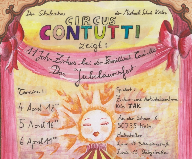 Der Circus Contutti, das sind 85 Schülerinen und Schüler aus dem Klassen 5 bis 11 der Michaeli Schule Köln. Sie bieten in diesem Jahr ein Zirkusspektakel der klassischen Art für die ganze Familie: Die Besucher tauchen ein in die Zirkuswelt hinter und vor den Kulissen und fiebern mit dem Zirkusdirektor Alfonso Contutti, seiner Frau Elisabeth Contutti und dem Rest der Contutti- Familie der hoffentlich pannenfreien Feier des 11. Geburtstags entgegen.