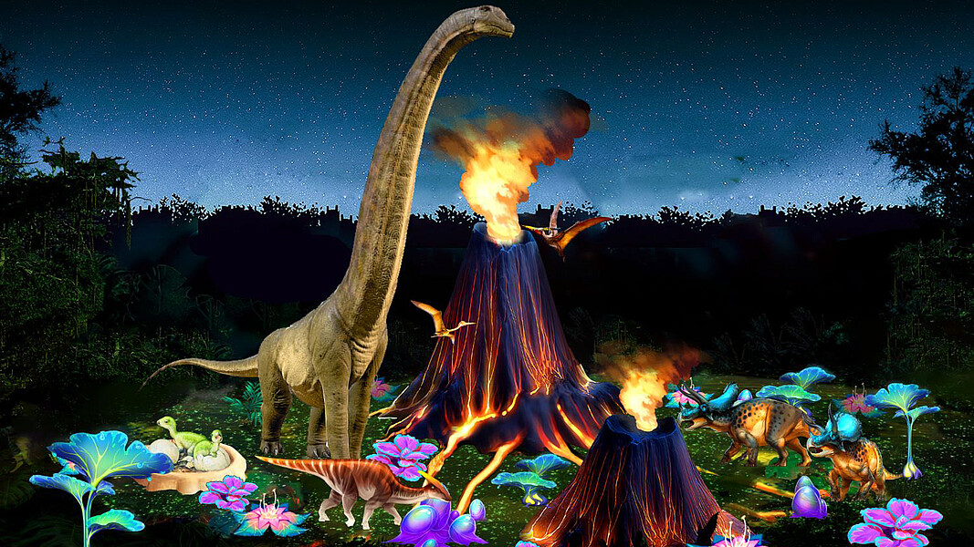 Gleichzeitig wird damit an die ebenfalls derzeit im Zoo laufende Dinoworld-Sonderschau mit lebensechten Figuren ausgestorbener Dinos wie T-Rex oder Triceratops angeknüpft. Die Licht-Designer haben passend dazu die XXL-Dino-Exponate kunstvoll in ihr Beleuchtungskonzept miteinbezogen. Highlight auf der großen Wiese in der Zoo-Mitte ist eine hell leuchtende Urzeitlandschaft mit einem wechselfarbigen, 12 Meter hohen Vulkan, der einen in dieser Form einzigartigen Kontrast zum direkt danebenstehenden, 30 Meter langen Argentinosaurus bietet.