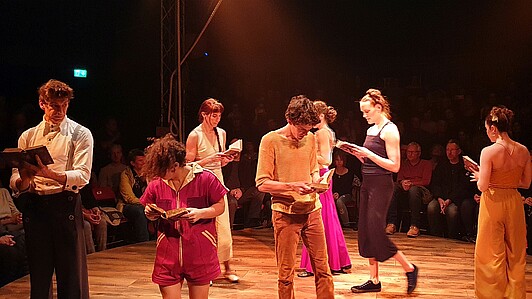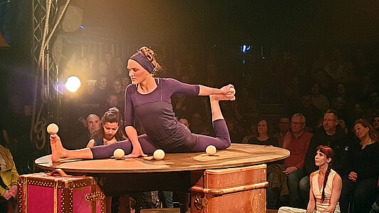 Doch bei aller Poesie und Magie mit Gesang und Tanz ist es auch die Artistik und Körperkunst, die die Zuschauer in ihren Bann zieht. Allen voran die Akrobatin Anna Abrams am Vertikalseil, die ihre im wahrsten Sinne des Wortes hohe Kunst zeigt. Atemberaubend ist auch die Darbietung der Luftakrobatin Ariadna Gilabert Corominas mit ihrer Trapeznummer hoch oben unter dem Zirkusdach. Grazil mit Ballettschuhen auf Gläsern tanzend oder auch auf dem Drahtseil zeigt die Französin Marie Le Corre hohe Balancierkunst. Ebenso beeindruckend: die Fußjongleurin Roxana Küwen, die ihre Seilnummer präsentiert und dabei ganz spielerisch Bälle über ihren Körper wandern lässt. Und es ist auch Florent Lestage, der Kegel mit Spazierstöcken jongliert und mit seiner anmutigen Unbeholfenheit das Publikum begeistert.