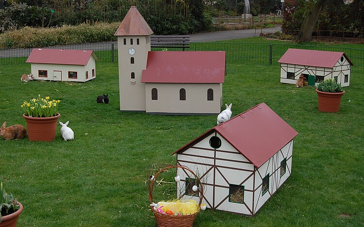 Das frisch renovierte Traditionsdorf bietet viel Platz. In der Miniaturnachbildung eines Fachwerkdorfes befinden sich sogar eine Kirche und eine Feuerwehr. Momentan zählen acht flauschige Kaninchen zu den Einwohnern des Dorfes. Bis zum Osterfest sollen, je nach Witterung, auch noch eine Henne mit Küken sowie Meerschweinchen einziehen.