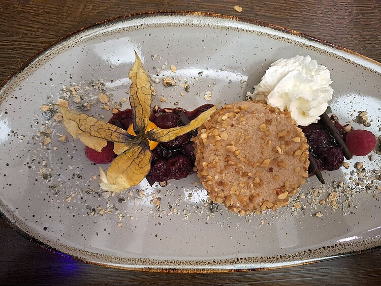 Beim Gastro-Konzept in einem harmonischen Ambiente steht das verbindende Element von Kunst und Kulinarik immer an erster Stelle. Heike Iserlohe betont, dass es von ihrem Team – „fühlt sich wie Familie an“ – gelebt würde. Genau wie eben jetzt zur Herbst- und Winterzeit die deutsche Martinsgans mit dem Esprit von Savoir-vivre eine Interpretation erfährt. Das Menümotto „Gans à la française“ lässt sich ganz klassisch als „magnifique“ charakterisieren: ein herrliches 3-Gänge-Essen, dessen Entrée aus einem Kürbiscremesüppchen komponiert ist, deren Aromen Mund und Gaumen mannigfaltig erfreuen. Die Münsterländer Freilandgans wird mit karamellisiertem Rotkraut und glasierten Maronen an Kartoffelknödeln wie von Muttern in Person von Bistrot99-Chefkoch Gregor Gehrmann serviert. Dieser führt die Küche seit dem Gründungstag. Auch der formvollendete Serviceleiter Fethi zählt zu den Personal-Urgesteinen. Er serviert das zarte Zimtparfait mit Kirschkompott zum Dessert mit weichem original französischem „Oui“-Akzent, bei dem einem die Ohren klingen. Vorm ersten Biss laufen die Augen über vor Schmelz.