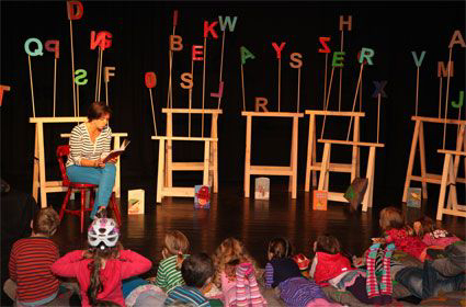 Ein großer Buchstabenwald umrahmte die Bücherbude, eine neue Lesereihe, die das Casamax-Kindertheater in Köln-Sülz gemeinsam mit der Fricke Stiftung für Bildung und Kultur Mitte September 2013 erstmalig auf die Bühne brachte.