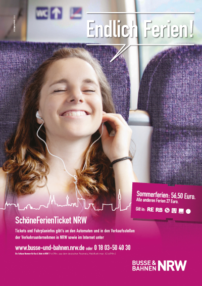 Das Schöne Ferien-Ticket NRW gilt für Schülerinnen und Schüler bis einschließlich 20 Jahren. Wichtig ist, dass sie während der jeweiligen Bus- und Bahnfahrten neben dem Ticket auch ihren Schülerausweis dabei haben. Das Ticket für die Osterferien ist ab sofort an allen Automaten der Deutschen Bahn sowie in ihren Verkaufsstellen und bei vielen Verkehrsunternehmen in NRW erhältlich. Es kann zudem online gekauft und direkt ausgedruckt werden.