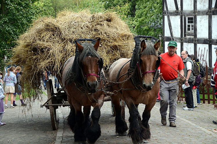 Schwere Rösser aus dem Rheinland und aus Westfalen, Belgien und Luxemburg pflügen und eggen, ziehen Baumstämme aus dem Wald oder fahren hoch beladene Getreidewagen zu dem historischen Bauernhof. Hier werfen Erntearbeiter die Garben in die vom alten Dampfross betriebene Dreschmaschine. Am Wochenende 21. und 22. September dreht sich auf der Veranstaltung „Nach der Ernte“ im Freilichtmuseum Kommern in Mechernich bei Köln alles um die Arbeiten, die noch vor einigen Generationen auf dem Hof und Feld, in Bauernküchen und auch bei den Handwerkern nach Abschluss der Ernte anfielen.