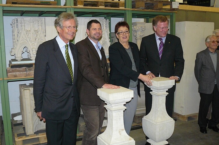 V.l.: Wilhelm von Boddien, Geschäftsführer des Fördervereins Berliner Schloss e.V., Hüttenmeister Uwe Schäfer, Dombaumeisterin Barbara Schock-Werner und Manfred Rettig, Vorstand und Sprecher der Stiftung Berliner Schloss – Humboldtforum (Foto: Claus Cornelsen)