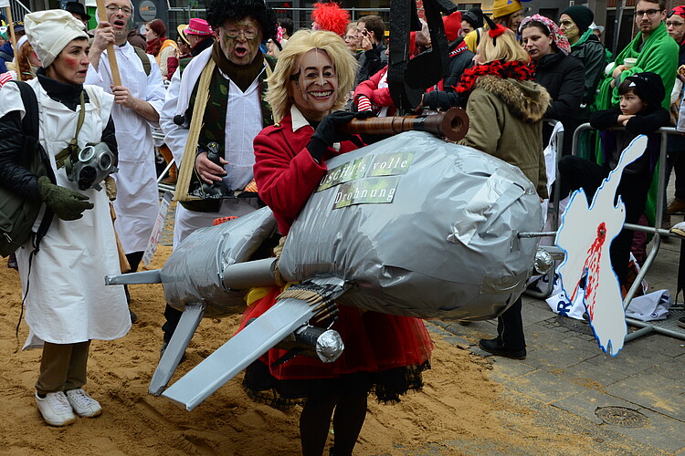 Andere Jecken thematisierten Kriege und globalen Drohnenterror, wieder andere machten die wachsende soziale Spaltung zum Ziel ihres Spotts. Eine letzte Gruppe zeigte den Klimakillern von RWE und Konsorten die Rote Karte.