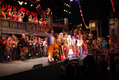 Eindrucksvoll fürs Auge: der Mariechenauftritt, bei dem die einzelnen Mariechen an roten Bändern über der Bühne schweben und artistische Einlagen bieten. Und Woodstock, das mal eben nach Zollstock verfrachtet wird.