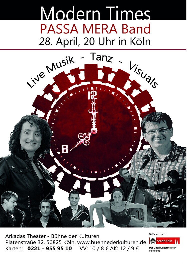 Am 28. April lädt die Passa Mera Band im Kölner Theater Bühne der Kulturen – das ehemalige Arkadas Theater – zu einem Konzertabend ein. Das aktuelle Programm der Band nennt sich Modern Times und ist ein Mix verschiedener Stil- und Kunstformen, der Elemente aus Pop, Jazz und ethnischer Musik vereint. Der Konzertabend enthält Live-Musik, Tanzeinlagen von Karen D. Savage und Videokunst auf einer großen Leinwand. Die Eigenkompositionen zu Modern Times werden dem Publikum durch kleine Geschichten nahe gebracht. Die interkulturelle Veranstaltung wird durch das Kulturamt der Stadt Köln gefördert.