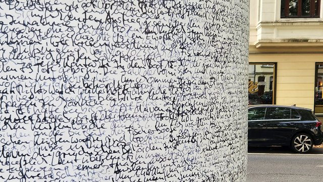 Für „Seestück IV“ hat die Künstlerin hunderte Zeitungsmeldungen und Berichte handschriftlich abgeschrieben, die sich in einem dichten, überlagernden Gewebe aus Schriftzügen ganz dicht über die 360-Grad-Fläche der Säule herumziehen. Das Werk widmet sich damit den Bootsunglücken Geflüchteter im Mittelmeer. Einzelne Nachrichten verschwimmen in der Masse, wirken wie Wellen eines Meeres – erst bei genauerem Hinsehen offenbaren sich bruchstückhaft die Inhalte.