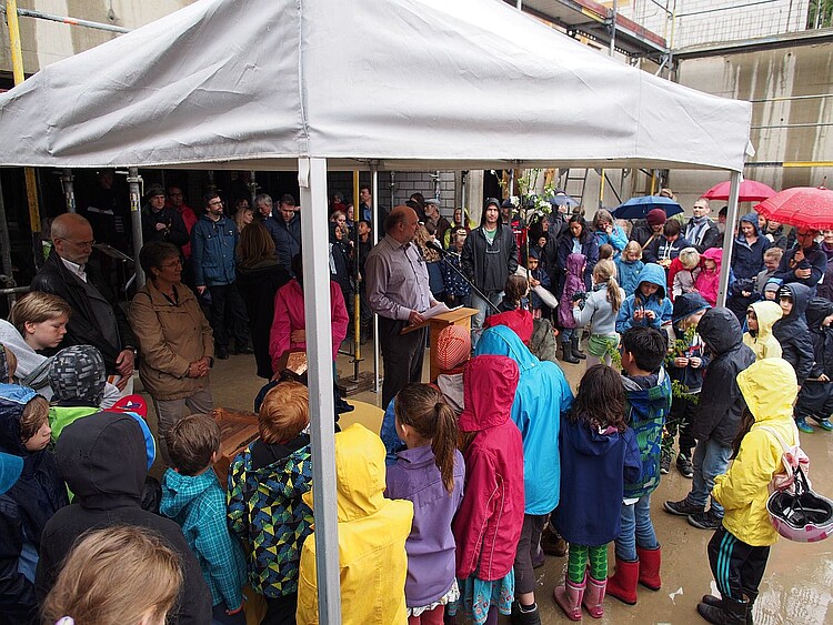 Am Samstag, 25. April, trotzten fast 200 Menschen den Regenschauern und versammelten sich auf dem Baugelände am Volksgarten, um den Grundstein für das neue Gebäude der Michaeli Schule Köln zu legen. Die Freie Waldorfschule hat für ihren Neubau viele Jahre mit widrigen Umständen kämpfen müssen, doch seit dem ersten Spatenstich am 6. Dezember 2014 verläuft der Bau zur Freude der Schulgemeinschaft planmäßig. Der Einzug in das neue Gebäude ist für die Osterferien 2016 geplant.