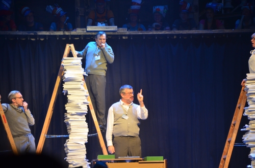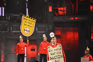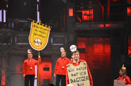 Überhaupt gibt es auch diesmal wieder viel Applaus für das, was die Stunksitzung ausmacht: die Mischung aus Kabarett und Karneval, die respektlosen Parodien und Spitzen gegen Politik und Kirche. So steht auch Joachim Meisner in diesem Jahr wieder im Fokus einiger Sketche. Und die Stunker verabschieden sich im Büßerhemd vom Kölner Kardinal, der ihnen „viele Jahre als Gaglieferant gedient hatte“ mit einem „Halleluja, Kölle singt zum Dank Halleluja“.