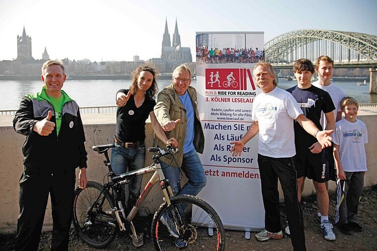 Beim 3. Kölner Leselauf für einen guten Zweck laufen oder Rad fahren mit u.a. Stephan Brings, Bernd Stelter und Henning Krautmacher (2., 3. und 4. von links) ( (Foto: Ride for Reading)