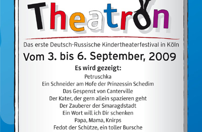 Vom 03. bis zum 06.09.2009 ist die Bühne der Kulturen in der Platenstraße in Köln-Ehrenfeld Schauplatz mehrerer Vorstellungen speziell für Kinder. Der vor kurzem gegründete Verein „Junge Theater Welt Köln e.V.“ präsentiert Ensembles aus Russland und Deutschland bei ihrem ersten Festival „Theatron“. Sowohl für Kinder, als auch für Jugendliche aus Köln und Umgebung gibt es die Möglichkeit, vier Tage lang verschiedene Vorstellungen zu besuchen, an Workshops teilzunehmen und somit auch eigene Künste und Talente zu zeigen.