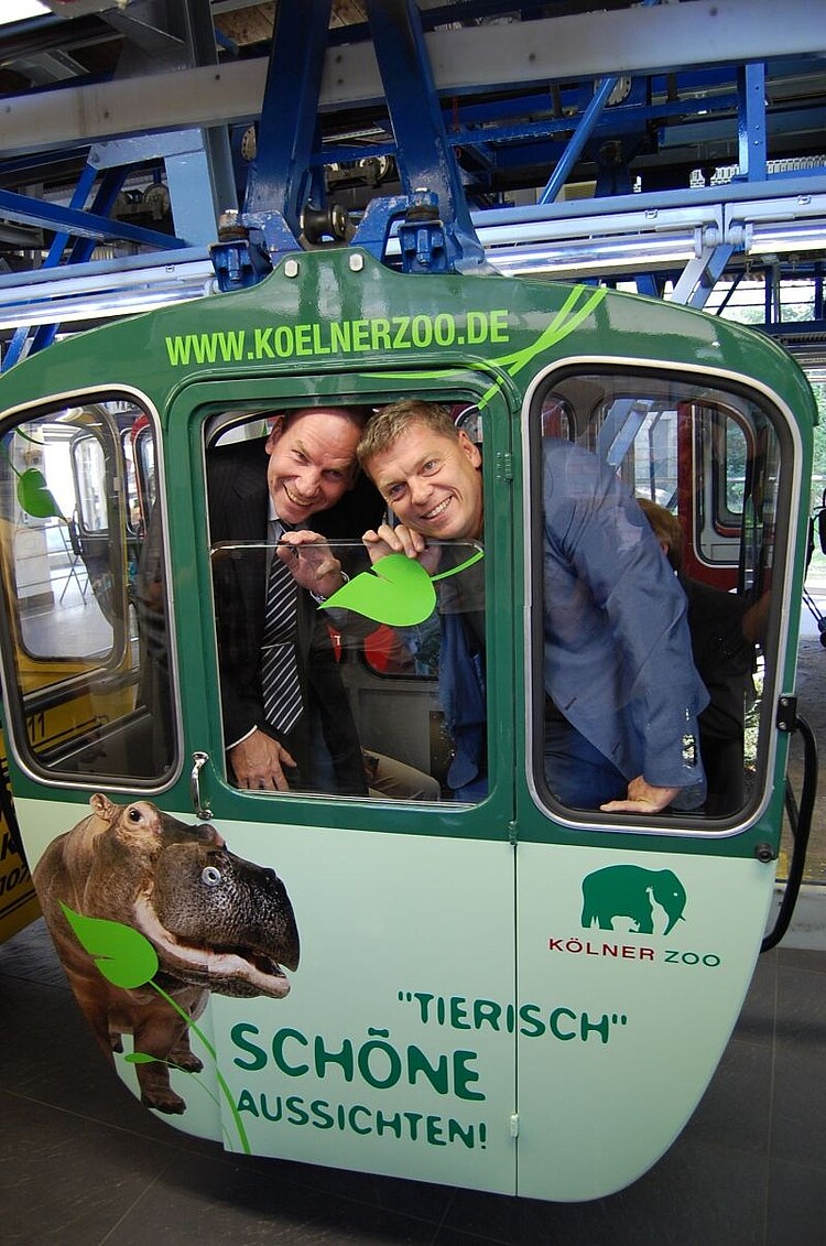 „Tiere schweben vom Zoo über den Rhein“ so Christopher Landsberg, der kaufmännische Vorstand des Kölner Zoos. Ab dem 25. Juli 2012 wirbt der <link internal-link internal link in current>Zoo auf einer eigenen Gondel der Kölner Seilbahn für den Besuch. Der Zoo soll somit auch hoch über dem Rhein sichtbar werden.
