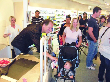 Schnell sein mussten Tom Gerhardt und Ole Bischof am vergangenen Freitag am Neumarkt. Zum einjährigen Bestehen des dm-Marktes versuchten sich der Komiker und der Judo-Olympiasieger eine Stunde lang im Wettkassieren und legten sich dabei ins Zeug. Jeder Cent, den sie kassierten, floss direkt in den Spendentopf zugunsten der Aidshilfe e. V. und „wir für pänz e. V.“ in Köln. Dabei sind insgesamt stolze 2.000 Euro zusammengekommen. Die Nase vorne hatte Tom Gerhardt. Er kassierte rund 700 Euro für die Aidshilfe. Als Pate von „wir für pänz“ hatte Ole Bischof am Ende rund 670 Euro in der Kasse. Die Beträge rundete das dm-Team jeweils auf 1.000 Euro auf.