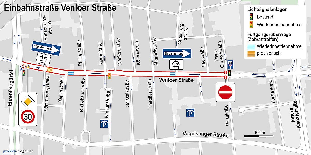 Ab Montag, dem 23. Oktober 2023, wird die Venloer Straße in Köln-Ehrenfeld zwischen Ehrenfeldgürtel und Piusstraße/Franz-Geuer-Straße zur Einbahnstraße. Damit sollen Konflikte zwischen den Verkehrsteilnehmer:innen minimiert und die Verkehrssicherheit für den Fuß- und Radverkehr erhöht werden. Zudem soll der Kfz-Verkehr reduziert und damit die Aufenthaltsqualität auf der zentralen und lebendigen Geschäftsstraße in Ehrenfeld erhöht werden.