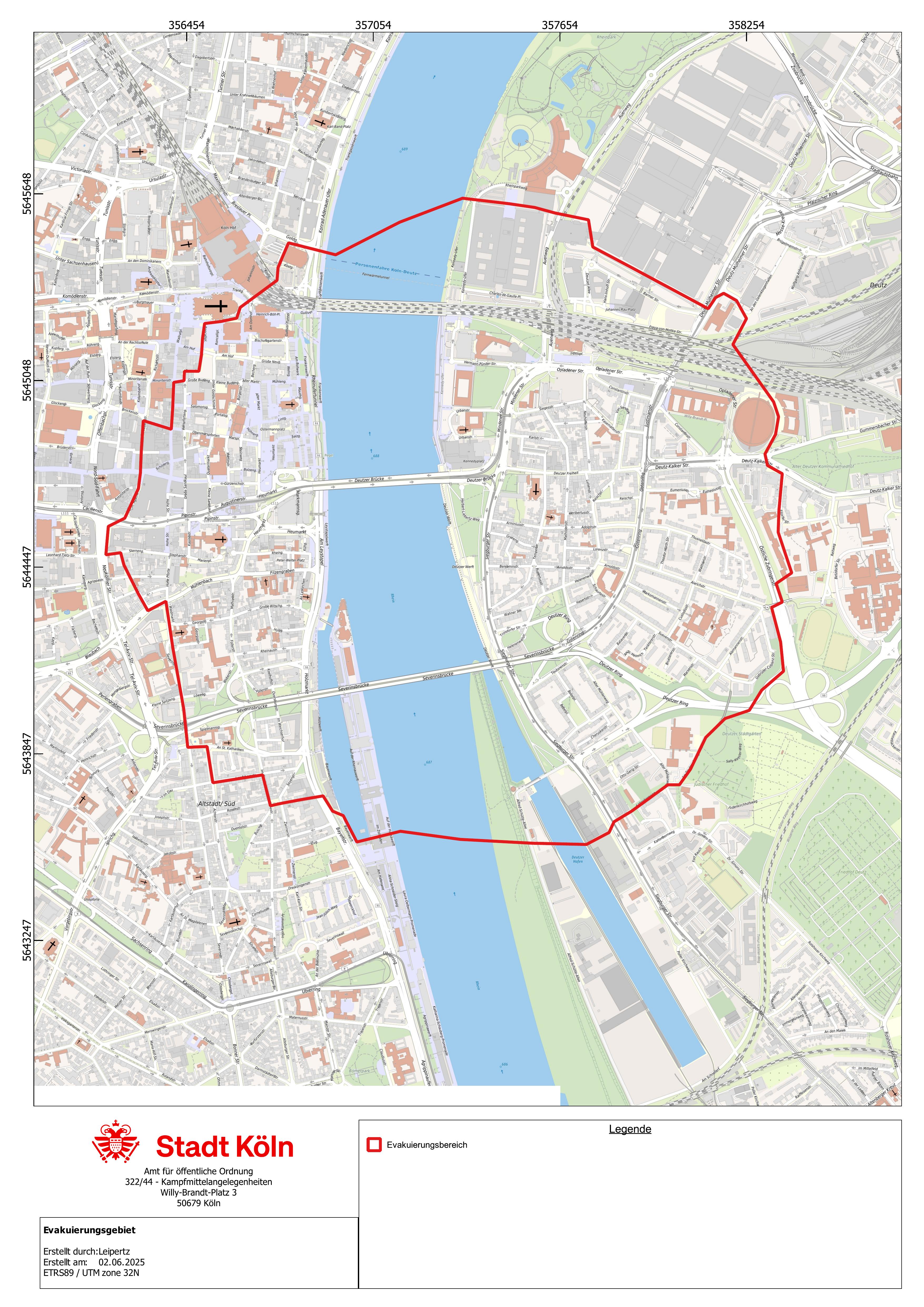 Der endgültige Gefahrenbereich wurde vom KBD mit einem Radius von 1.000 Metern festgelegt. Rund 20.000 dort gemeldete Personen werden von Evakuierungen betroffen sein. Weitere bedeutende Infrastruktur betroffen: u.a. drei Brücken (Severinsbrücke, Deutzer Brücke, Hohenzollernbrücke), die Bundeswasserstraße Rhein, der südliche Zugverkehr zum Hauptbahnhof, Linien der KVB (u.a. 1, 7, 9), der Bahnhof Messe/Deutz, das Stadthaus Deutz – Westgebäude, das Rathaus plus weitere städtische Dienststellen, Konzert- und Veranstaltungshäuser (u.a. Lanxess-Arena, Musical Dome, Philharmonie), der LVR, diverse große Unternehmen (u.a. RTL, HDI), neun Schulen, diverse Kitas, sowie die Kölner Altstadt und Deutz mit 58 Beherbergungsbetrieben.
