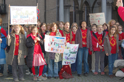 Deshalb versammelten sich die Klassen 5-7 am Mittwoch, dem 19.11.2008, auf dem Rathausplatz. Mit einer musikalischen Darbietung und Transparenten machten sie auf ihre Situation aufmerksam.