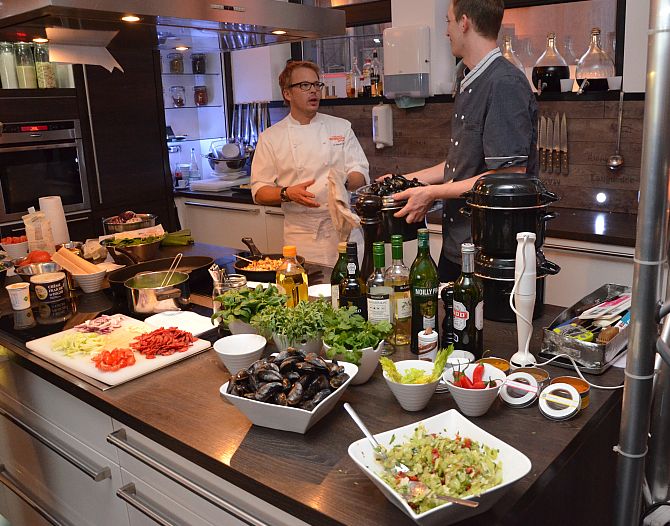 Das Holländische Muschelbüro, das Tourismusbüro VVV Zeeland und das Niederländische Büro für Tourismus & Convention ins Kochstudio Rheinauhafen zum Miesmuschelessen ein.