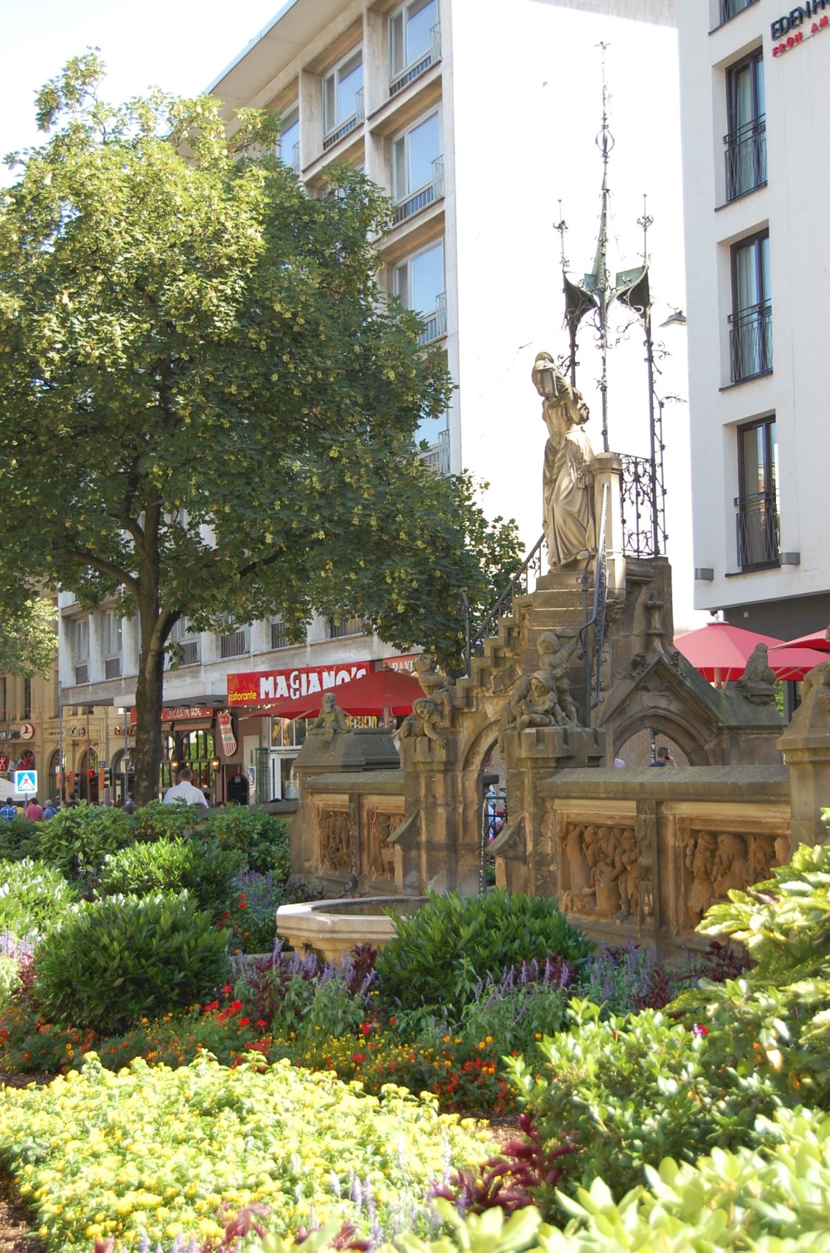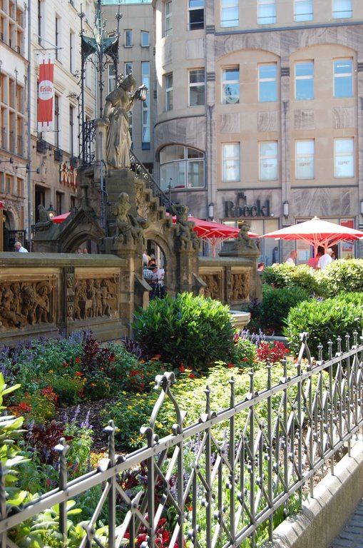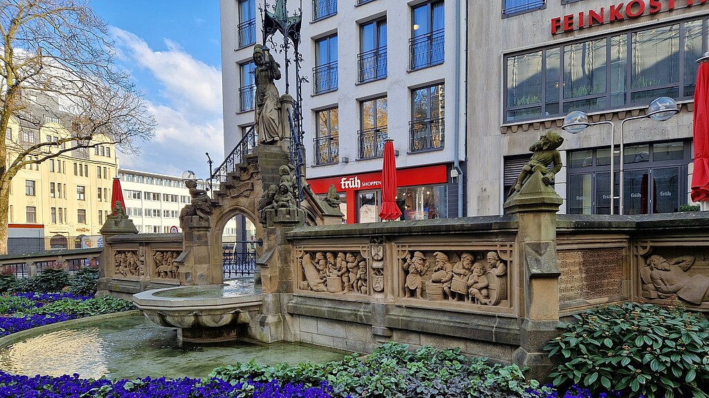 Diese Szene wurde im Heinzelmännchenbrunnen festgehalten. Auf der Spitze einer Treppe steht die neugierige Schneidersfrau und guckt mit ihrer Laterne auf die stolpernden Heinzelmännchen hinab.