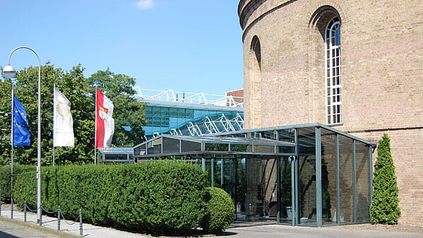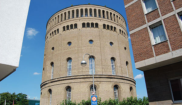 Der Wasserturm wurde mit Frechener Backstein hochgemauert, der dem ganzen Bauwerk einen warmen Ton verleiht. Die Fassade des riesigen Zylinders wird durch den sparsamen Einsatz unterschiedlich großer viereckiger, bogenförmiger und kreisrunder Fenster wirkungsvoll gegliedert.