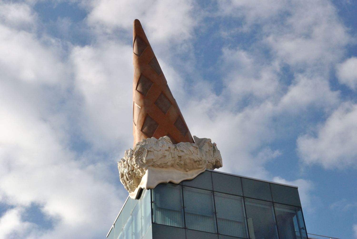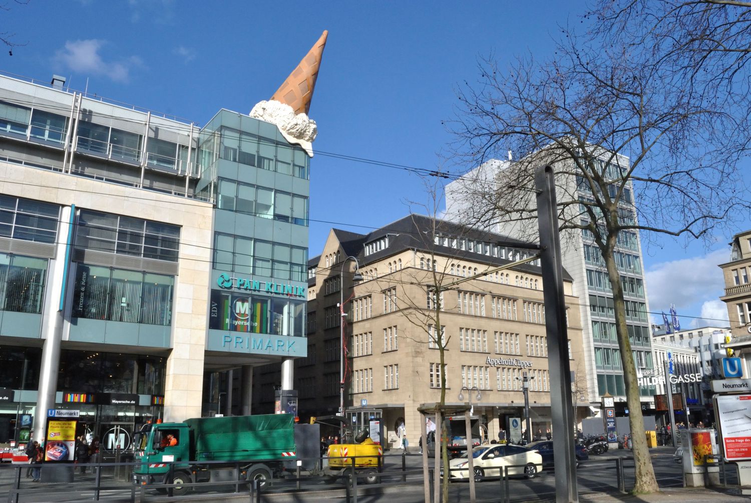 In unmittelbarer Nachbarschaft zu der Neumarkt Passage befindet sich seit 1998 die größere Neumarkt Galerie, deren Dach ein beliebtes Fotomotiv schmückt: Eine übergroße Eiswaffel ragt mit der Spitze nach oben in den Himmel, die süße Füllung läuft schmelzend an der Glasfassade des Kaufhauses hinab. Das skurrile Kunstwerk mit dem Titel „Dropped Cone (dt.: „fallen gelassenes Eishörnchen“), wurde von den Amerikanischen Künstlern Claes Oldenburg und Coosje van Bruggen entworfen und ist mittlerweile zum ikonischen Wahrzeichen des Platzes geworden.