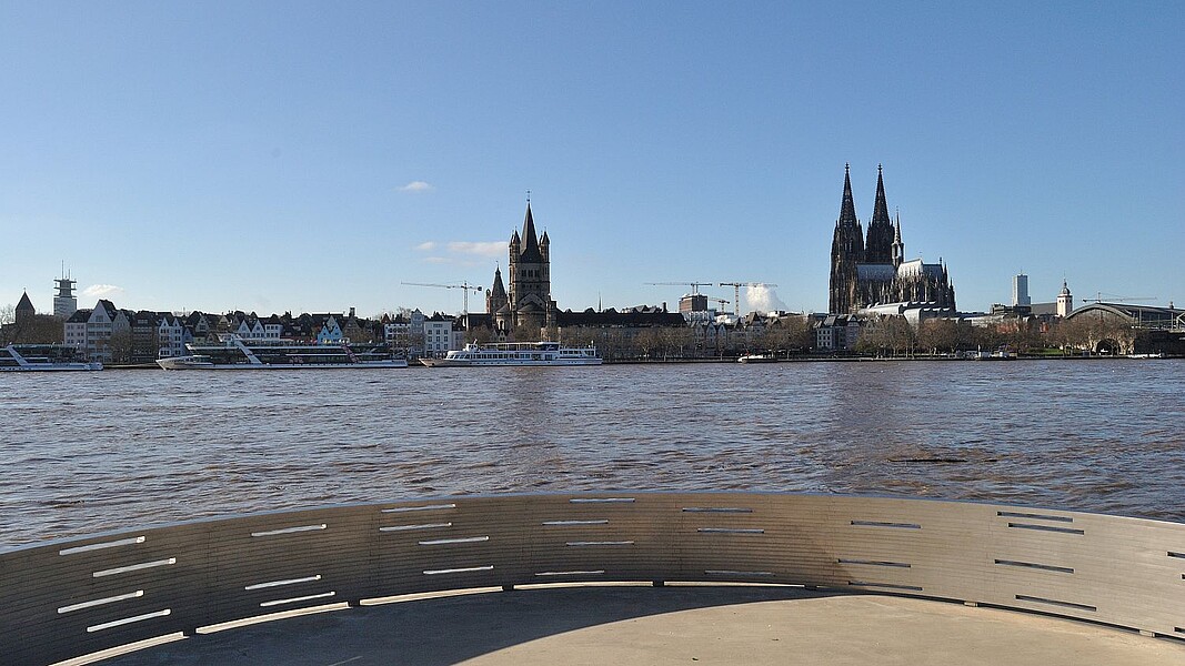 Wenn man es sich hier mit einem kalten Getränk gemütlich gemacht hat, kann man den Blick weit über das linksrheinische Stadtgebiet schweifen lassen – ein Panorama, das das historische und das moderne Köln verbindet. Direkt gegenüber der Freitreppe ragen hinter dem wellenförmigen Dach der Kölner Philharmonie die ikonischen Doppelspitzen des Doms in die Höhe.