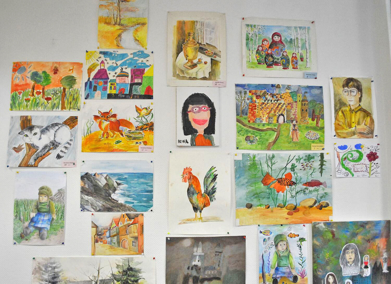 Folgt man ihrem Blick, fallen einem in der Tat die unterschiedlichen Namen der Kinder auf, die die Bilder gemalt haben: Irina, Mustafa, Lisa – unter den Namen ist das Alter der jungen Maler vermerkt. Von 6 Jahren bis 28 Jahren ist alles dabei.